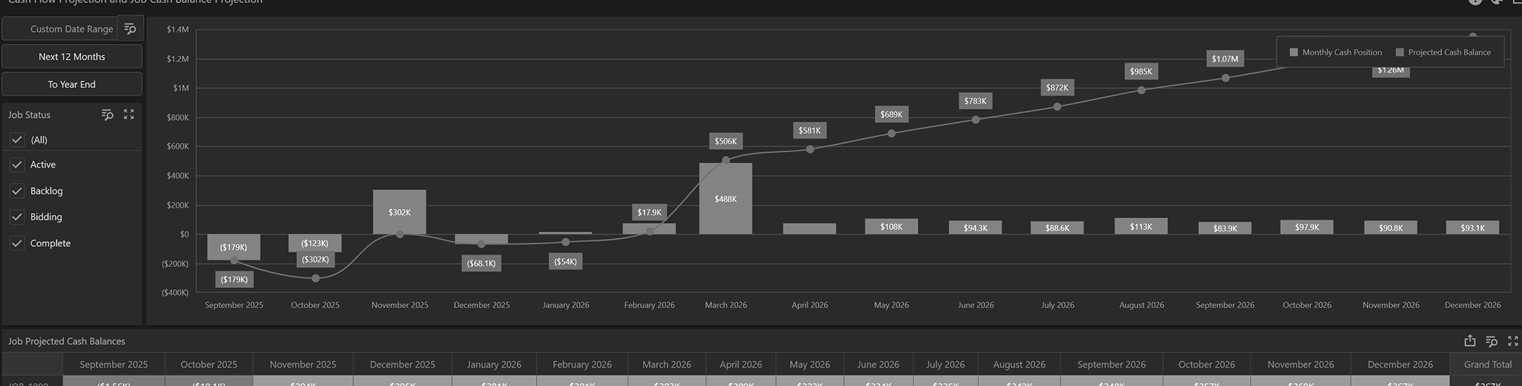 The Cash Flow Projection dashboard projects the realistic cash position for individual jobs, and the summary of all jobs, for a given time period.